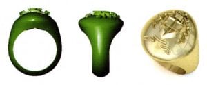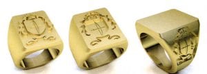Finally, you may wish to identify the design on a curved surface – such as the side shield of a signet band. In that example, use closed, flat curves fatigued in the Side View viewport to create the shape of the shield. Then, using the Project control, apply these curves to the side of the signet band. Identify the ring and the curves representing the shield into appropriate boxes in Matrix'south Surface Pullback tool, assign a depth and bevel shape, and employ the Cap command to create a solid "cap" surface in the shape of the shield. Position the blueprint then that information technology fully intersects the shield, and, after Boolean Unioning the design together, run a Boolean Intersection on the design and the cap you lot only created.